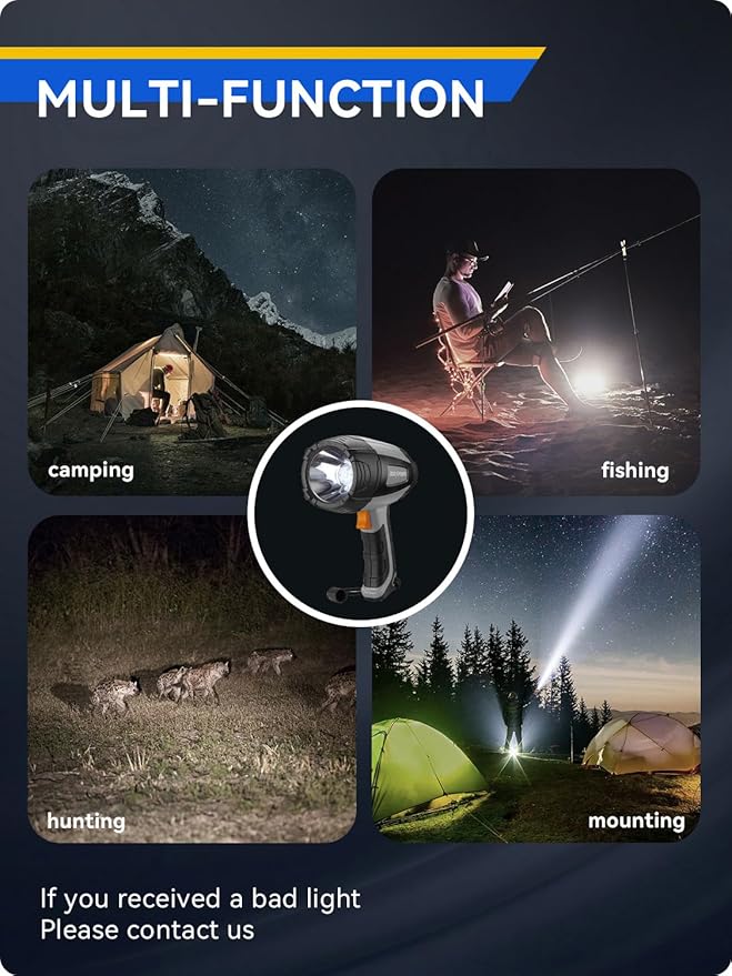 - 【Compact & Durable】:Impact-resistant ABS and RUBBER allows the high lumen hunting spotlight to fall from 1M. Even in harsh environments, you don't have to worry about it breaking down.
