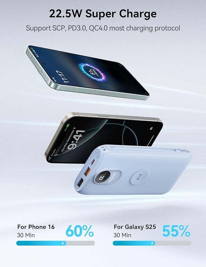 - PD3.0 & QC4.0 Fast Charging: Portable battery pack has three expedited charging ports, USB-A1 22.5W, USB C 20W, output cable Type-C 20W, charge most smart phones from 0 to 100% within 1 hour, for instance, the USB C top up your Phone 16 Pro in 55 minutes. Additional, this plug in portable charger provides 2.5W wireless speed for iWatch.