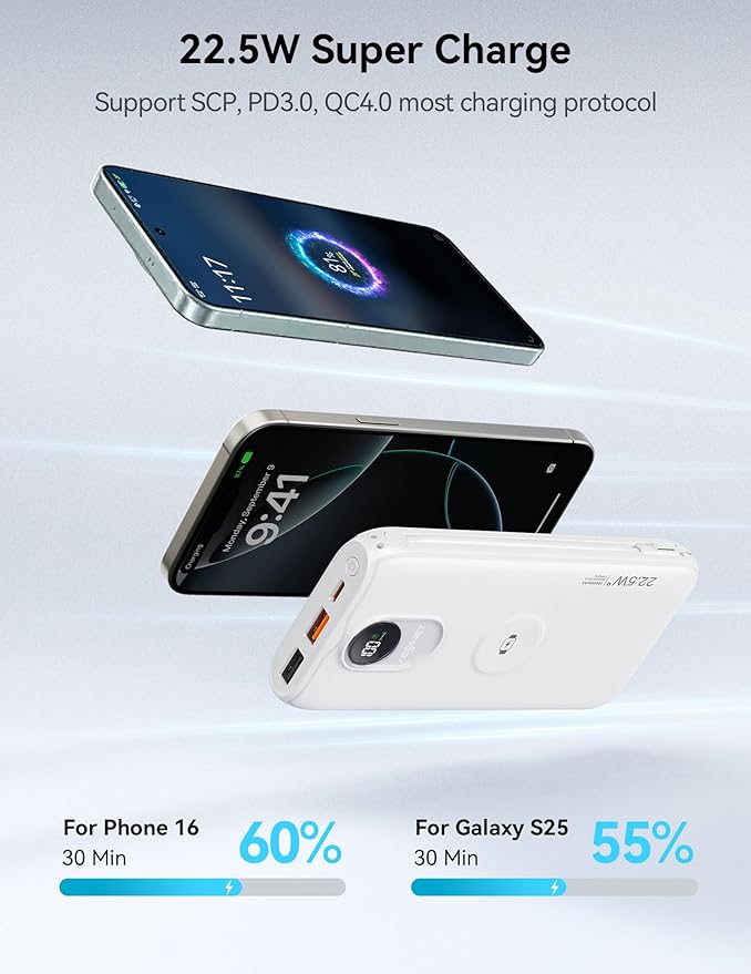 - PD3.0 & QC4.0 Fast Charging: Portable battery pack has three expedited charging ports, USB-A1 22.5W, USB C 20W, output cable Type-C 20W, charge most smart phones from 0 to 100% within 1 hour, for instance, the USB C top up your Phone 16 Pro in 55 minutes. Additional, this plug in portable charger provides 2.5W wireless speed for iWatch.