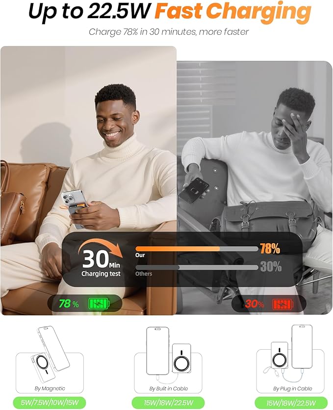 - ⚡️【MagSafe Dual-Mode Fast Charger】This magsafe portable charger has a built-in USB-C cable for 22.5W PD fast charging (78% in 30 mins). 15W MagSafe wireless. Smart switching. Fully iPhone-compatible.