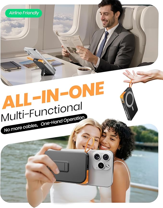 - ⚡️【3-in-1 Wireless Power Bank】Built-in USB-C cable + 15W MagSafe + extra Type-C port. 22.5W PD fast charging. Charges iPhone 15 Pro 2x, S24 ~2x. Compatible with iPhone 12-17, Samsung S/A/Z series, Pixel. Ideal for travel.