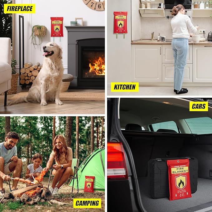 - Safety & Protection Fire Blanket:Put out small fires quickly and easily without making a mess (unlike regular fire extinguishers). Simply pull down the tab to unfold the blanket. Place these fire blankets in your home kitchen, backyard, fireplace, grill, office, campground, or as part of your vehicle's survival kit for total protection.