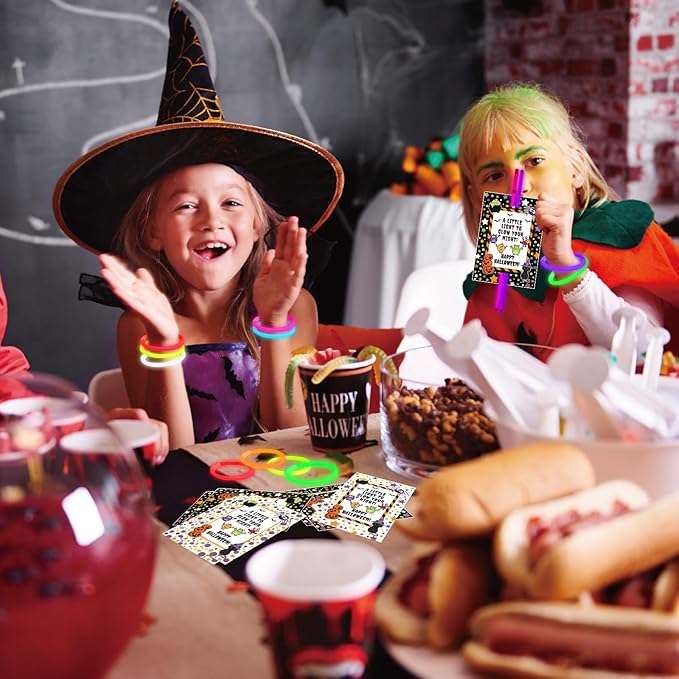 - What you get: You will recieve 48 sets halloween party favors sets, including 48 festive Halloween cards and 96 glow sticks(2 per card), totally 144pcs, creating 48 ready-to-give spooky treats. Perfect for Halloween parties, trick-or-treaters, and classroom exchanges