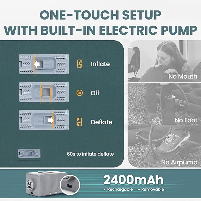 - ⏩ USB-C ELECTRIC PUMP, AUTO INFLATE & DEFLATE--With the built-in USB-C electric pump, this camping pad automatically inflates or deflates in a minute— No foot-pumps, no blowing. After a long day of hiking or driving, you deserve a pad that sets itself up. If power runs out, simply switch to the integrated manual valve for effortless backup, anytime, anywhere