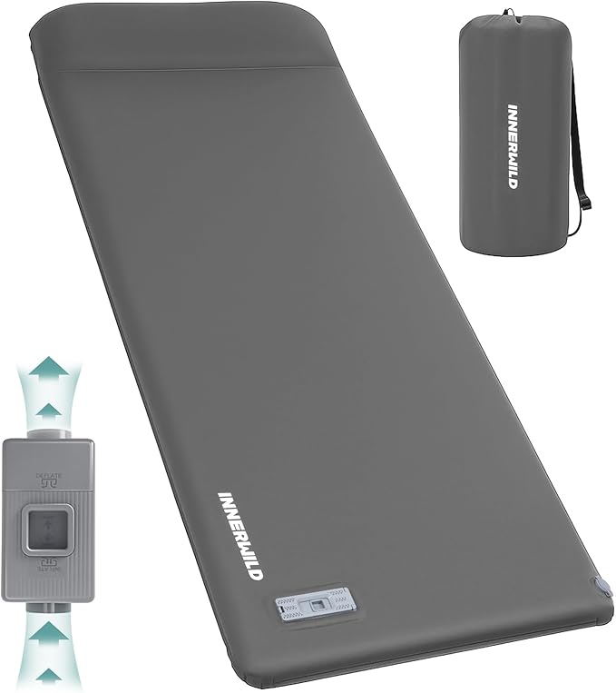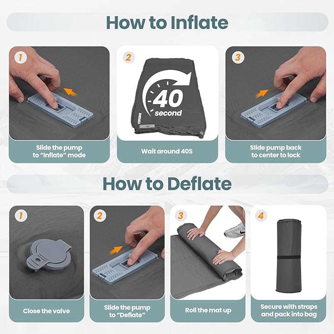 - ⏩ USB-C ELECTRIC PUMP, AUTO INFLATE & DEFLATE--With the built-in USB-C electric pump, this camping pad automatically inflates or deflates in a minute— No foot-pumps, no blowing. After a long day of hiking or driving, you deserve a pad that sets itself up. If power runs out, simply switch to the integrated manual valve for effortless backup, anytime, anywhere