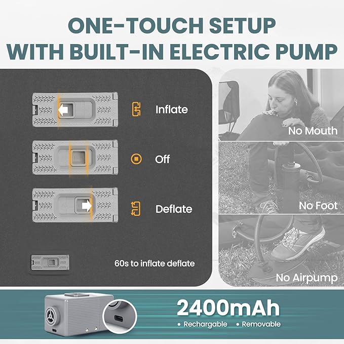 - ⏩ USB-C ELECTRIC PUMP, AUTO INFLATE & DEFLATE--With the built-in USB-C electric pump, this double camping pad automatically inflates or deflates in a minute— No foot-pumps, no blowing. After a long day of hiking or driving, you deserve a pad that sets itself up. If power runs out, simply switch to the integrated manual valve for effortless backup, anytime, anywhere