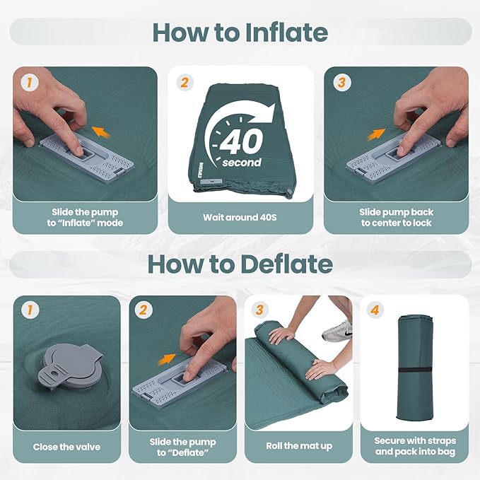 - ⏩ USB-C ELECTRIC PUMP, AUTO INFLATE & DEFLATE--With the built-in USB-C electric pump, this double camping pad automatically inflates or deflates in a minute— No foot-pumps, no blowing. After a long day of hiking or driving, you deserve a pad that sets itself up. If power runs out, simply switch to the integrated manual valve for effortless backup, anytime, anywhere