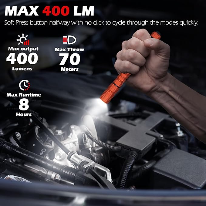 - 【【High Brightness & Long Runtime】 Delivering 400 lumens in high mode, the pocket flashlight illuminates up to 70 meters. The low mode provides up to 8 hours of continuous use, making it ideal for extended tasks or use in low-light environments. Whether for professional use or outdoor activities, FORTO penlight offers the perfect balance of brightness and runtime.