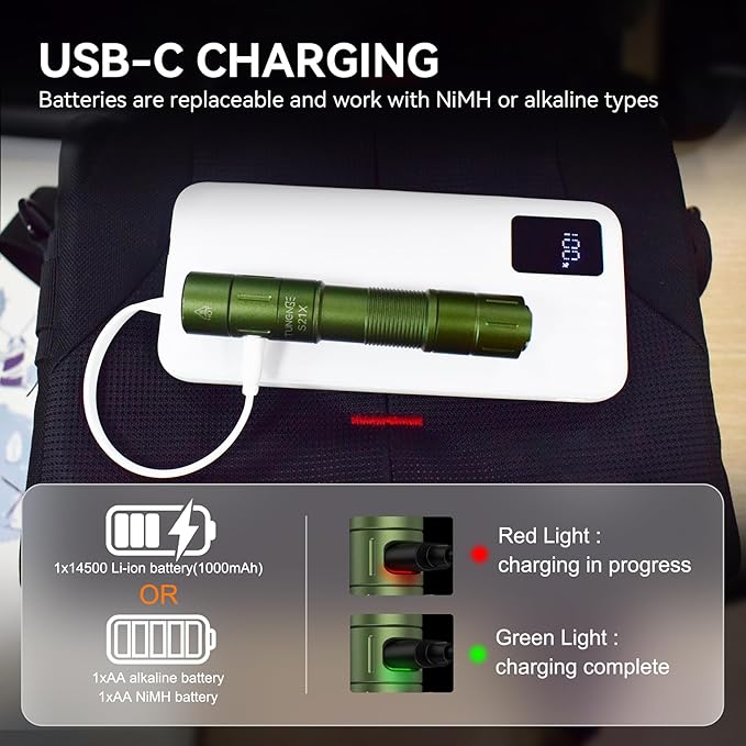 - USB-C CHARGING & AA FLASHLIGHT: Equipped with a 1000 mAh rechargeable battery (no need to remove the battery for charging), it is also compatible with standard AA batteries (nickel-metal hydride/alkaline), making it easy to replace them at any time without worrying about not being able to find batteries to use