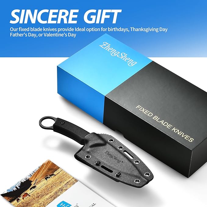 - 4. Function: Perfect for the everyday carry user. The perfect addition to camping essentials, toolboxes, work wear, and fishing and hiking gear. Fixed blade knife with Kydex sheath to enhance the knife's texture and quality. Whether for adventure, work, and survival, ZhengSheng fixed blade knives are up to the task of everyday life
