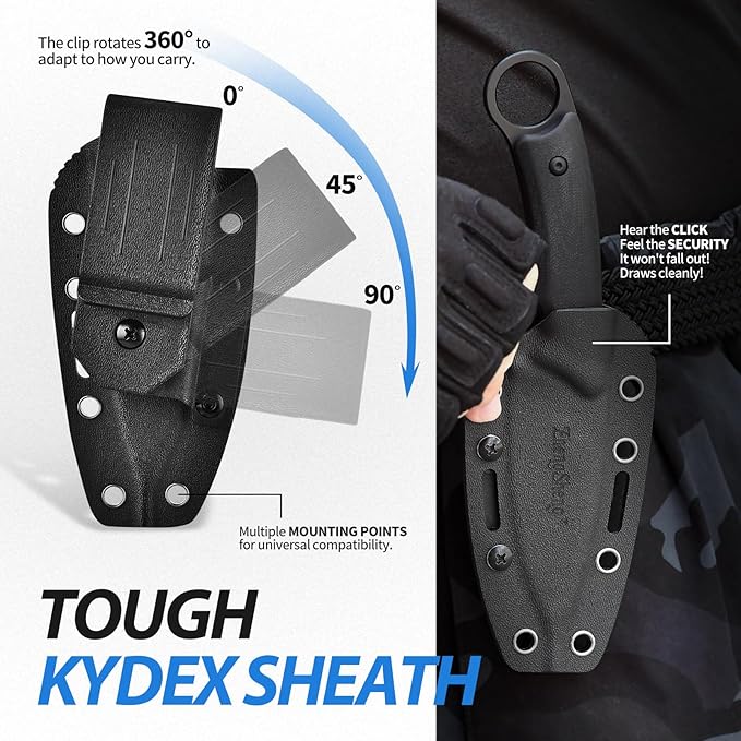 - 1. Adjustment Kydex Sheath: Safe high- strength lightweight, high temperature resistance and corrosion resistant imported Kydex material sheath for easy adjustment and everyday carry. The sheath is tight, without rattle, but still allows quick deployment. It holds the knife well and has good retention