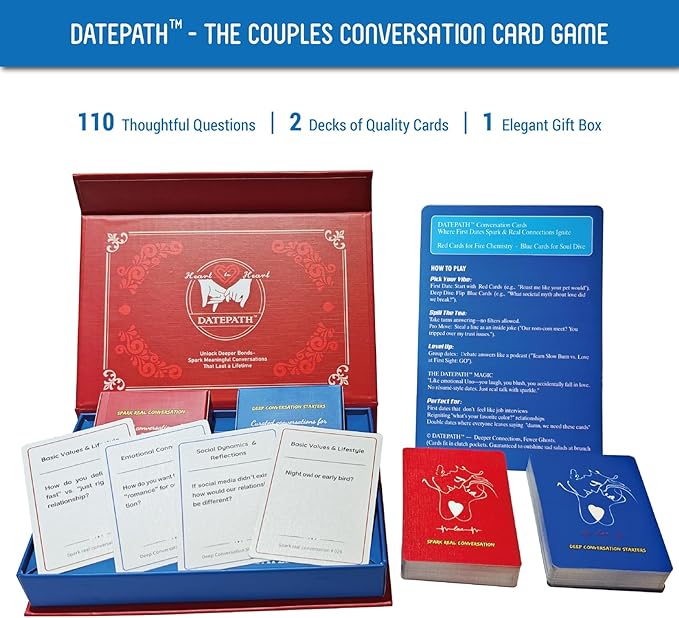 - ✨ SPARK DEEP CONNECTIONS & LAUGHTER: Say goodbye to awkward silences and surface-level chats! Our dating card game features 110 thought-provoking questions designed to unlock authentic stories, dreams, and laughs. Whether you're on a first date or celebrating 20 years, DATEPATH guides you to meaningful conversations that strengthen your bond and rekindle romance.