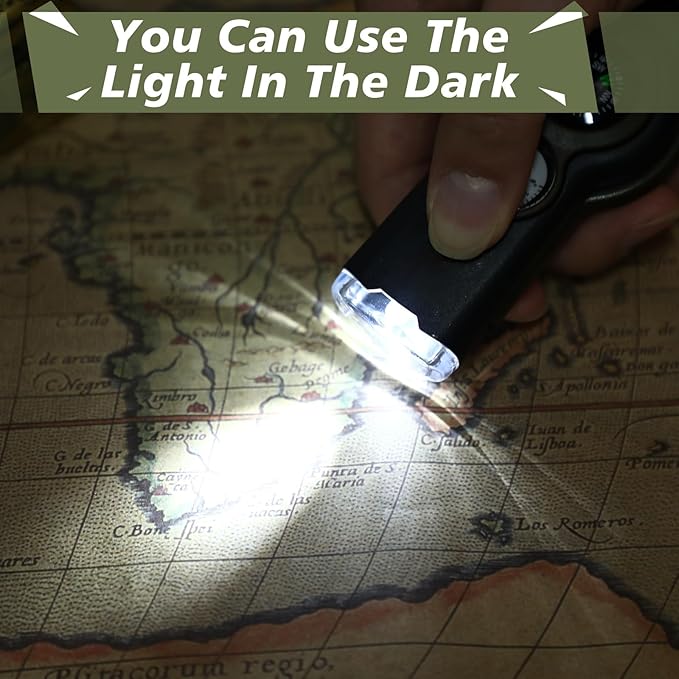 - Multifunctional Design: this camping whistle is thoughtfully designed with 7 integrated features, a whistle, a compass, a thermometer, a magnifying glass, a reflector, a storage bin and LED light; All these components can be quickly disassembled and assembled, suitable for providing essential information during outdoor activities; With all these features intertwined, every adventure becomes safer and more enjoyable