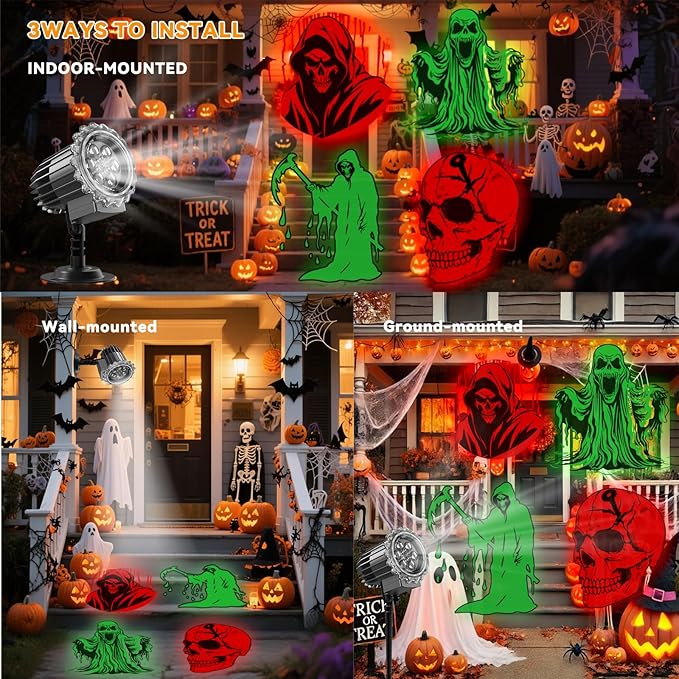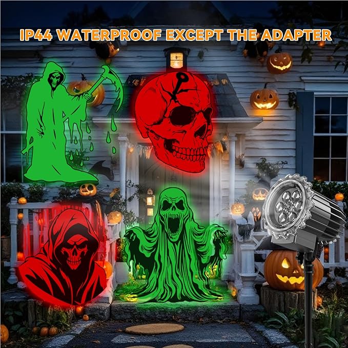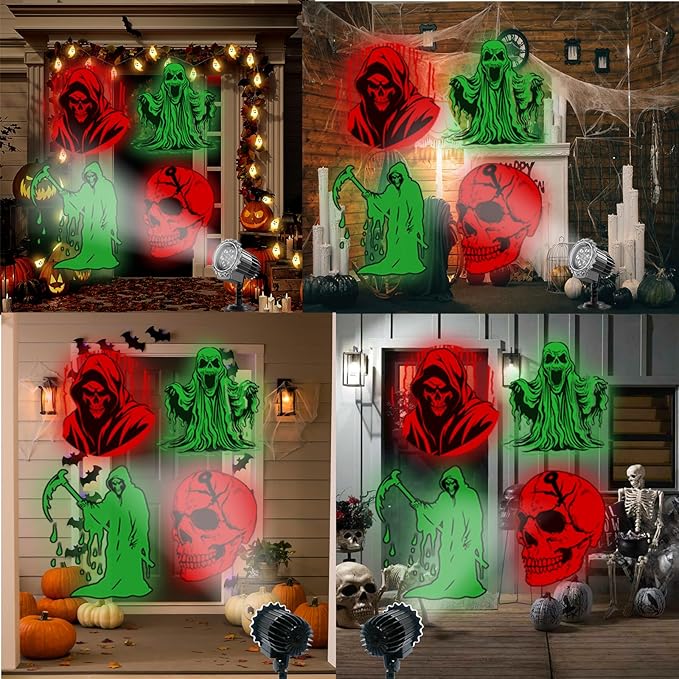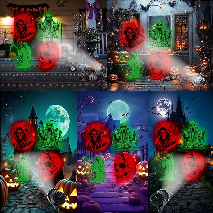 - 【Vivid Halloween Projector with 4 Themes】:This ghost projection light features 4 exclusive patterns—skeletons, the Grim Reaper, ghosts, and Cthulhu—all designed for Halloween. LED-powered for sharp, bright patterns that stay clear even indoors under normal lighting, whether in white or red/green.Project up to 32 feet with consistent clarity and brightness—perfect for yards, porches, or indoor decor!