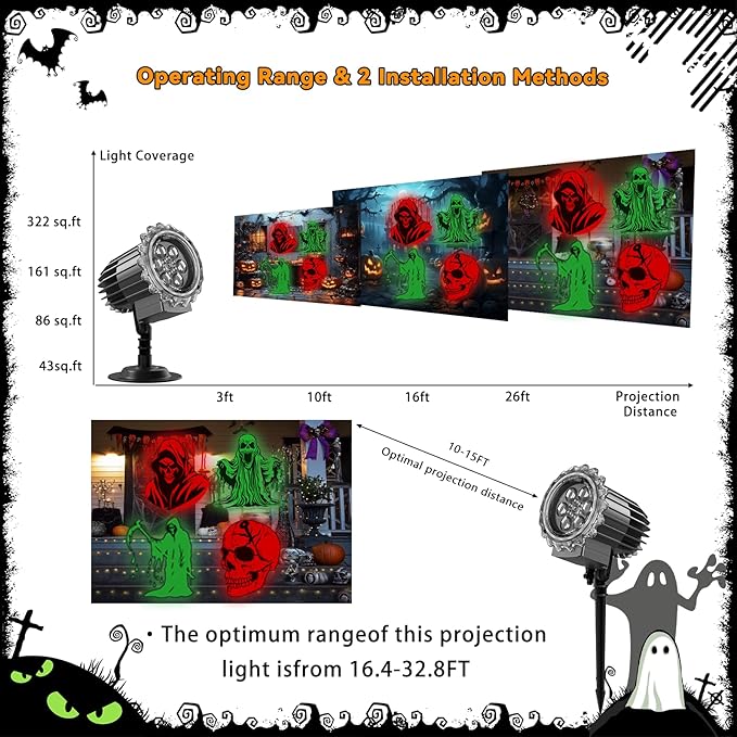 - 【Easy Installation with 16ft Power Cord】:The Ghost Halloween Projection Light features a circular base and ground stakes for flexible placement on floors, walls, or outdoor surfaces like lawns and gardens. Simply plug in the included 16-foot power cord, adjust the projector’s angle, and instantly launch your Halloween light show—perfect for busy holiday setups and first-time users alike!