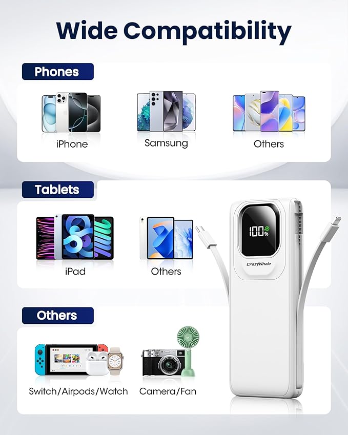 - Built-in Cables for Ultimate Portability: There are 3 output lines in total, which can charge almost many types of port devices. For example, USB C Cables and IOS Cable for mobile phones, tablets, for iPhone and for iPad, Samsung, so you can enjoy hassle-free charging without the need to carry extra cords.