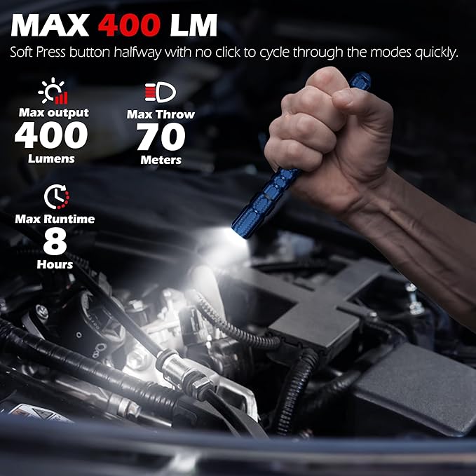 - 【High Brightness & Long Runtime】 Delivering 400 lumens in high mode, the pocket flashlight illuminates up to 70 meters. The low mode provides up to 8 hours of continuous use, making it ideal for extended tasks or use in low-light environments. Whether for professional use or outdoor activities, FORTO penlight offers the perfect balance of brightness and runtime.