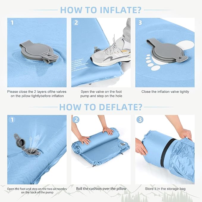 - Upgraded Valves For Easier Storage: Storage of foam sleeping mats has always been a challenge, and to make it easier, we have revolutionized the valve making it a dual-use valve. When inflating, simply open the two layers for self-inflating. When you need to deflate, OPEN ONLY THE FIRST LAYER and be sure to keep the second layer closed, in this state, air can only go out and not in, then you just need to squeeze out the air to complete the storage.