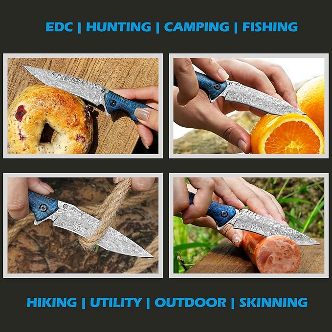 YOUSUNLONG Folding Knife - Hammered Damascus Steel Blade - Blue Damascus texture G10 Cover