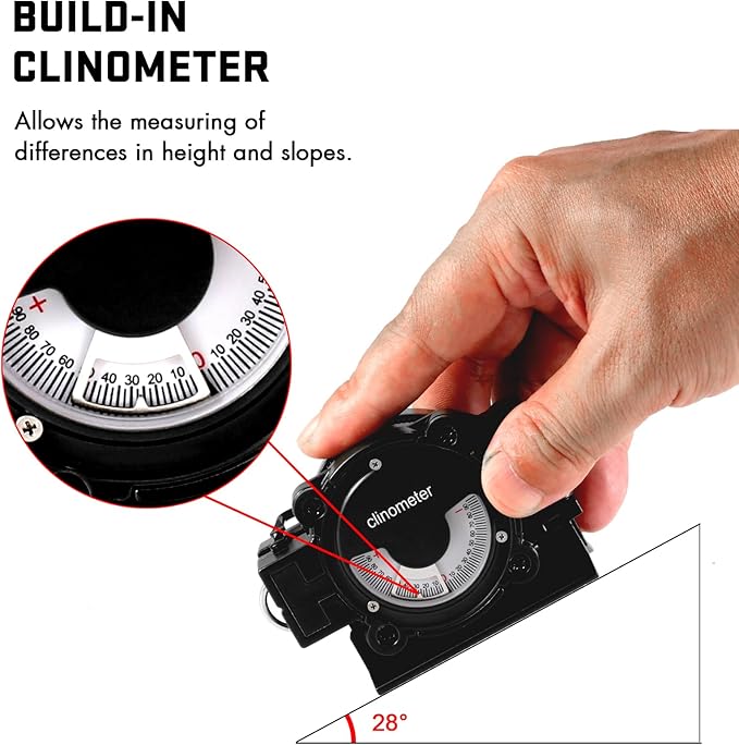- 【Built-in Clinometer】- The Eyeskey Multifunctional Military Sighting Navigation Compass comes equipped with a clinometer, allowing you to measure the angle of slope, elevation, and avalanche hazards while engaging in outdoor activities such as mountain climbing, backcountry skiing, or hiking steep slopes. This feature ensures your safety and enables you to make informed decisions in challenging terrains.