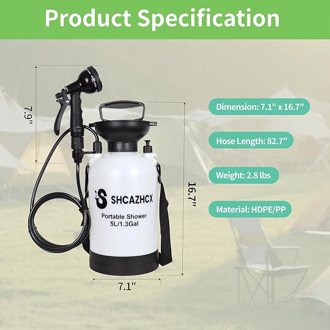 - [Durable & Portable Design] - Made from rugged HDPE and PP materials, this portable camping shower is lightweight, leak-proof, BPA-free, and built to last. With its convenient shoulder strap, you can carry it easily for camping, trail clean-ups, or use it as a portable beach shower after a day in the sand and surfing.