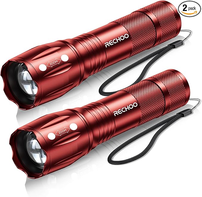 RECHOO LED Flashlight 2 Pack Red, Tactical Flashlights High Lumens with 3 Modes, Pocket Small Flash Light, Waterproof Zoomable Flashlights for Home Emergency, Camping Essentials (Battery Included)