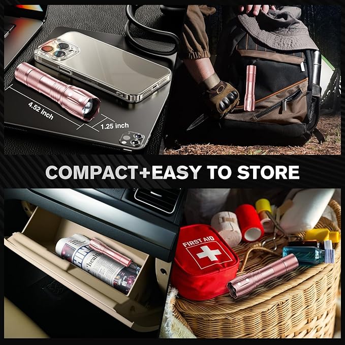 - Portable Small Flashlights: Our tactical flashlight is remarkably portable, measuring just 4.52*1.25 inches, and a lightweight of just 0.17 lb, which fits perfectly in your coat pocket, car, and hand; Compact and easy to carry; Ideal for various indoor and outdoor activities, this compact flashlight is perfect for camping, hunting, dog walking, cycling, or dealing with a power outage