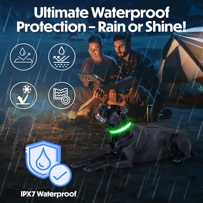 - DURABLE, WEATHERPROOF & DOG-PROOF: Crafted from premium nylon, this outdoor lighted dog collar is built to withstand all weather conditions and rough play. The high visibility reflective dog collar is strong, long-lasting, and water-resistant, pet collars perfect for active dogs who love the outdoors.
