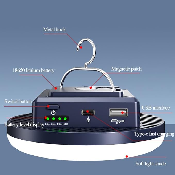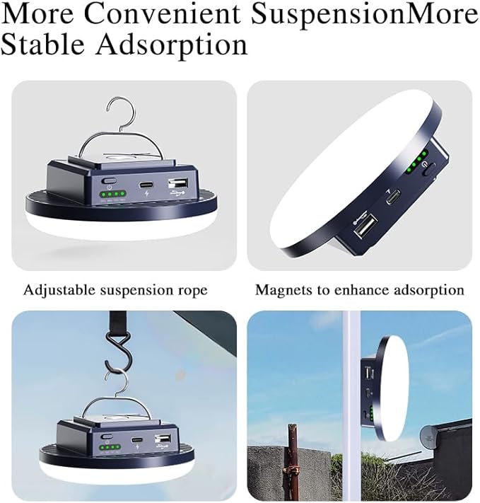 - Magnetic suction + hook, flexible and portable: With both a strong magnetic base (adsorbed on metal surfaces) and a hanging hook, it can be easily fixed on the top of a tent, car hood, tree branches, etc. The portable camp lamp is suitable for various outdoor lighting scenarios.
