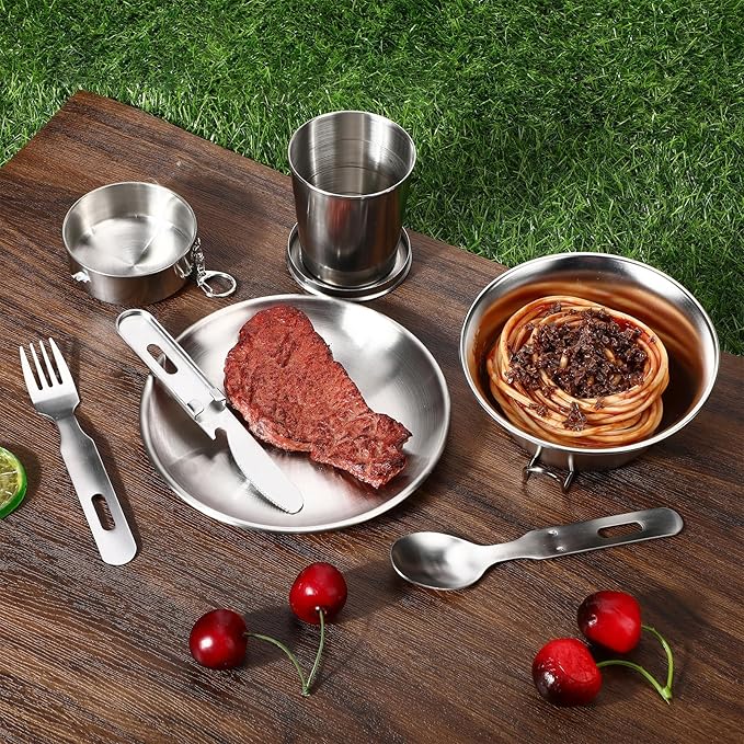 - What you get: Our stainless steel dinnerware includes 2 collapsible cups, 2 plates, 2 bowls, 2 spoons, 2 forks, 2 knives and a drawstring bag. This complete camping plates cups and bowls set has you covered for all your dining needs