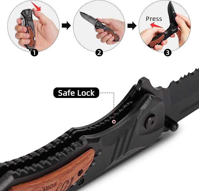 - Safety Design: Reliable liner lock design secures the blade to prevent unexpected closure; can use it for hiking, travel, survival, climbing, cycling, EDC, safety and any outdoor activity, as well as general use and daily cutting housework