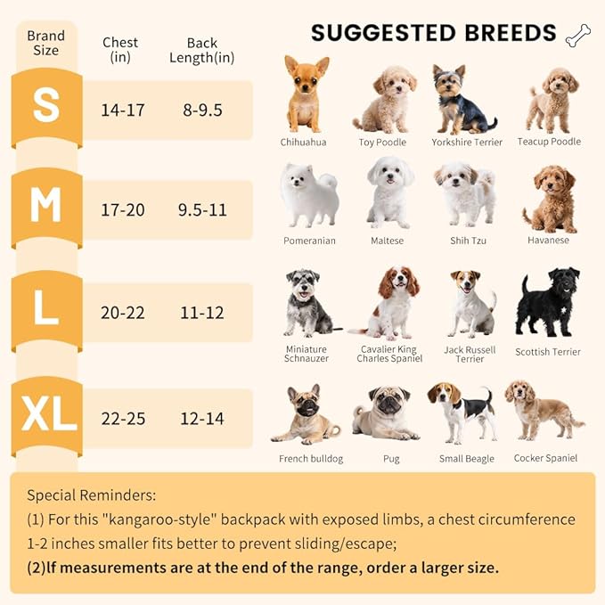 - 【Sizing Guide: Match to Pet’s Body Type】: Multiple size options fit pets of different body types. Before purchasing, measure your pet’s weight, body length, chest girth and leg circumference (weight is not the sole sizing basis). For detailed measuring methods, please refer to our video—you’re welcome to watch it for step-by-step guidance. Refer to the detailed size chart to choose, and whether for large dogs or small cats, you’ll find a comfortably fitting backpack.