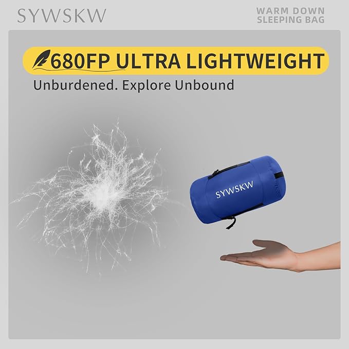 - Lightweight and compact : The sleeping bag for adults are filled with 1.1 lb, 1.76 lb and 2.65 lb duck down,making it ideal for summer, spring, autumn, and winter. Compressed to just 11.8 in by 7.08 inch ( Fill 1.1 lb down), ideal for adults and youth backpacking, camping, backpacking, car travel and hotel rest