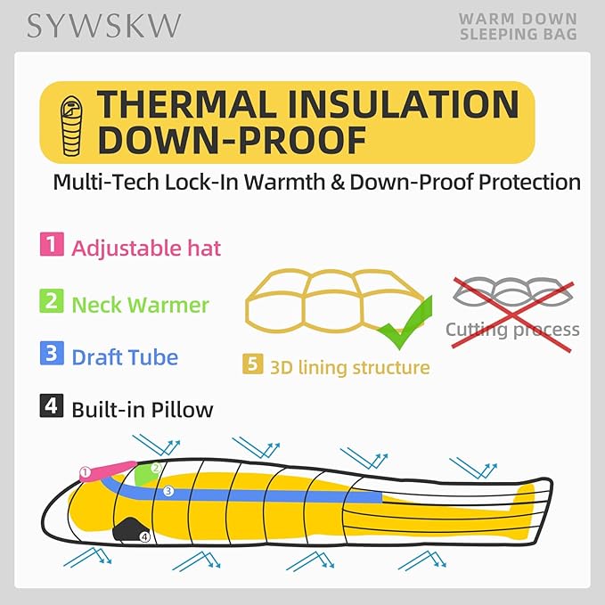 - Extra Wide and Long: The widened shoulders eliminate waist compression (86.6 in x 33.5 in). The sculpted baffles and double-stitched seams prevent cold spots, ensuring a comfortable sleep at every place,ideal for men and women height up to 78.8 inches, weight 220 lb