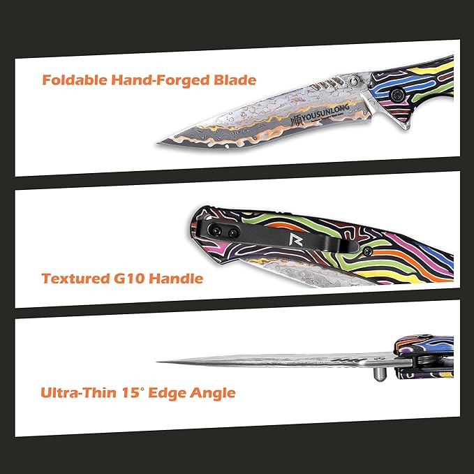 YOUSUNLONG Pocket Folding Camping Knife - CuMai Damascus Steel Blade - Multicolored G10 Handle Cover