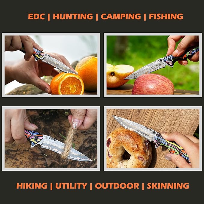 - Feast your eyes on the exquisite design of this elegant custom Japanese hammered Damascus steel pocket folding knife! Take it with you every day (EDC). Great for hunting, fishing, camping, hiking, and all outdoor and sporting activities.