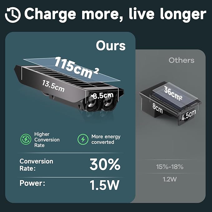 - 【Larger and Flexible Solar Panel】 Enjoy faster charging with advanced solar panels offering a 30% higher conversion rate. Adjust panels 180° vertically for maximum sunlight capture and precise spotlight direction. Perfect for illuminating any outdoor space efficiently