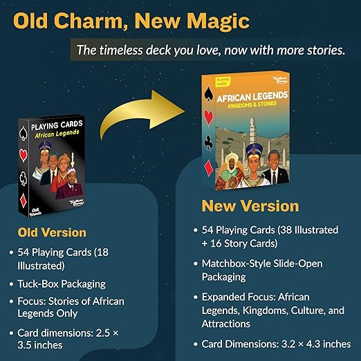 - Educational African Legends Playing Cards: 54 beautifully illustrated cards featuring African legends, kingdoms, and stories. For kids and adults — enjoy classic card games while learning African history and celebrating cultural heritage.