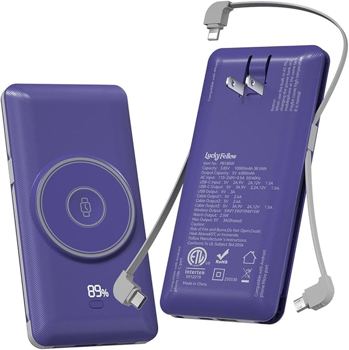 - 6 Devices Charging Simultaneously: This portable charger battery pack features 5 outputs, including 3 cable outputs and USB-C & USB-A outputs. At the same time, you can use wireless charging on the front of the power bank to charge your mobile phone or watch, Charge up to 6 devices simultaneously. For Mag-Safe power bank supports 5W, 7.5W, 10W and 15W wireless charging; USB-C ports support Power Delivery up to 20W, allowing for fast charging of USB-C enabled devices; USB-A ports deliver up to 22.5W, supporting Quick Charge 3.0 for rapid charging of legacy devices