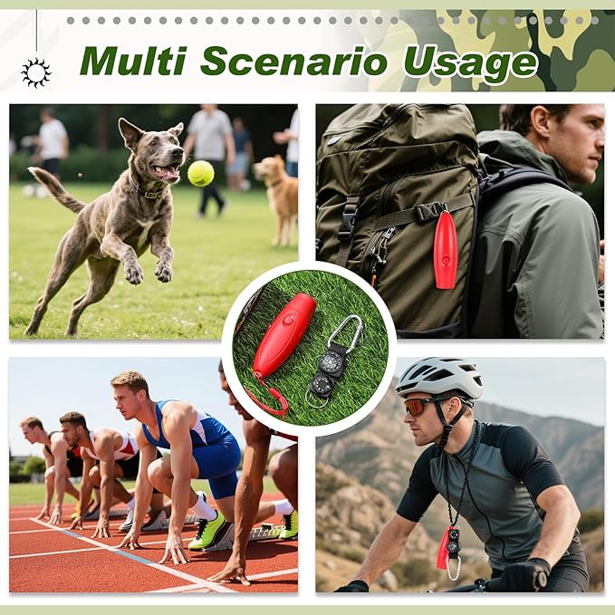 - Press-type usage design +detachable Compass Accessory: When you long press the side button to turn on the machine, a red light will come on,Press again to change the tone(Please note that the side markings only represent functions,It's not a pushing design); This bear horn contains compass and thermometer functions, with the thermometer reading from 0°F to 120°F; The compact 4.57×1.14 inch(11.6×2.9 cm) body includes a lanyard for instant wrist, belt, or backpack access during emergencies