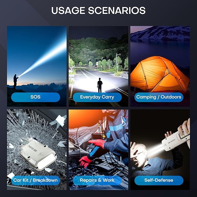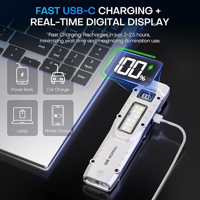 - 【USB-C Rechargeable Flashlight – Power You Can See & Trust】 No more dead batteries or guessing games. This USB-C rechargeable flashlight charges fast via car, laptop, or power bank, while the digital display shows exact battery % and charging status. The built-in lockout mode prevents accidental activation in your pocket or bag. A reliable flat high lumen flashlight for work, travel, and daily EDC use.