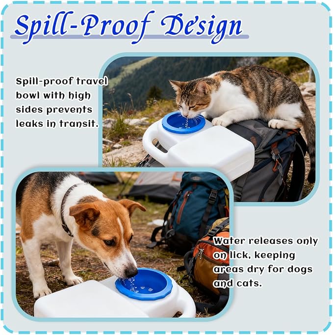- Ideal Travel Companion: Lightweight and portable with generous capacity, this spill-proof bowl is perfect for road trips, camping, hiking, or daily outings. Place flat for easy pet access to water during journeys.