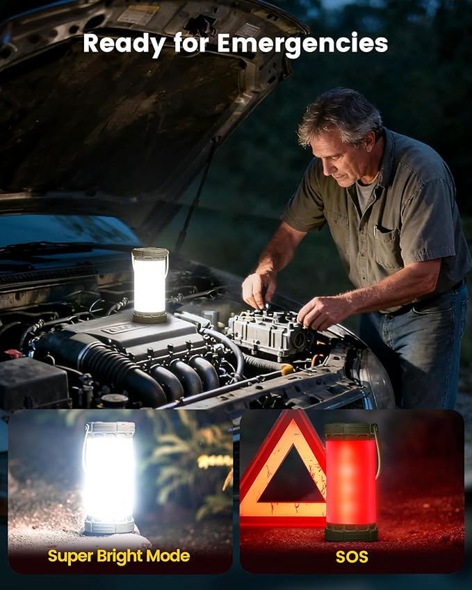 - [Emergency Ready] Designed with safety in mind, the lantern lamp features a 1500LM super bright mode for instant wide-area lighting, an SOS red strobe to signal for help, and a Type-C, keeping you connected and visible during storms, roadside emergencies, or unexpected power outages.