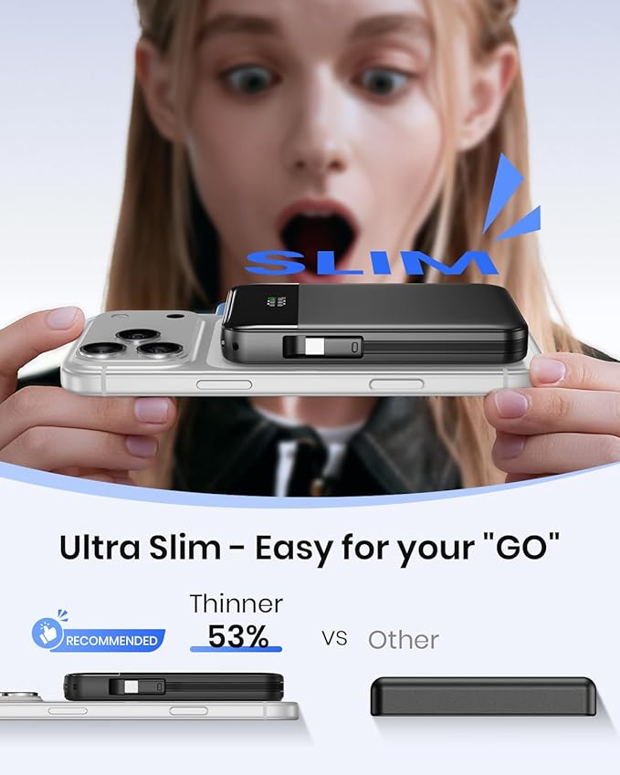 - 【Slim Design|Snap On and Go】Lightweight and ultra-thin, this magnetic charger for iphone attaches seamlessly to your phone like an invisible extra battery. Whether commuting, exercising, or traveling, your hands remain free—so you can shoot, chat, and play without limits.