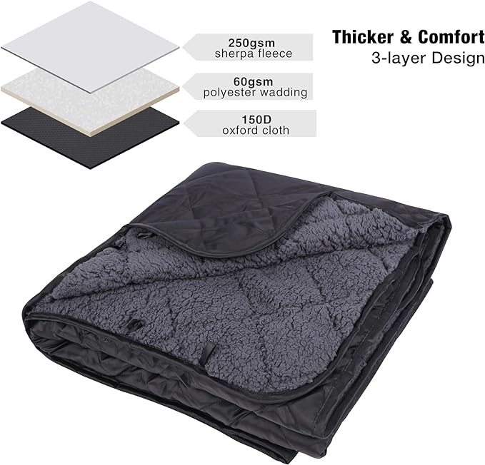 - Plush and Comfy: Outdoor Blanket is made of 150D oxford backing and 250gsm polyester sherpa lining, filled with 60gsm polyester wadding, thick enough to keep you cozy all day