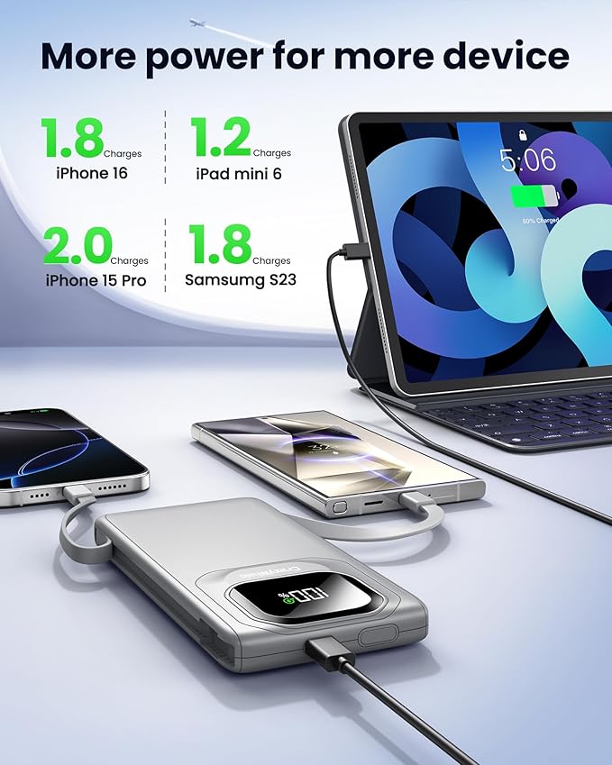 - Fast Charging: Experience fast charging speeds with 22.5W Power. Get your devices back to 50% + charge in just less 30 minutes with this powerful power bank for iPhone and Android, ensuring you spend less time waiting around and more time enjoying your devices.