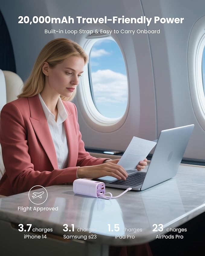 - 💡【20,000mAh Power Bank – Week-Long Battery】The 20,000mAh high-capacity power bank is built to meet your week-long business travel or whole-weekend family trip charging needs. With its massive battery capacity, it can fully charge an iPhone 17 Pro Max up to 3.5 times, iPad Pro twice, MacBook Air 15inch up to 1.05 times, and Steam Deck gaming console 1.8 times. Whether you're on a business trip or enjoying outdoor adventures, this portable charger keeps all your essential devices powered up and ready to go.