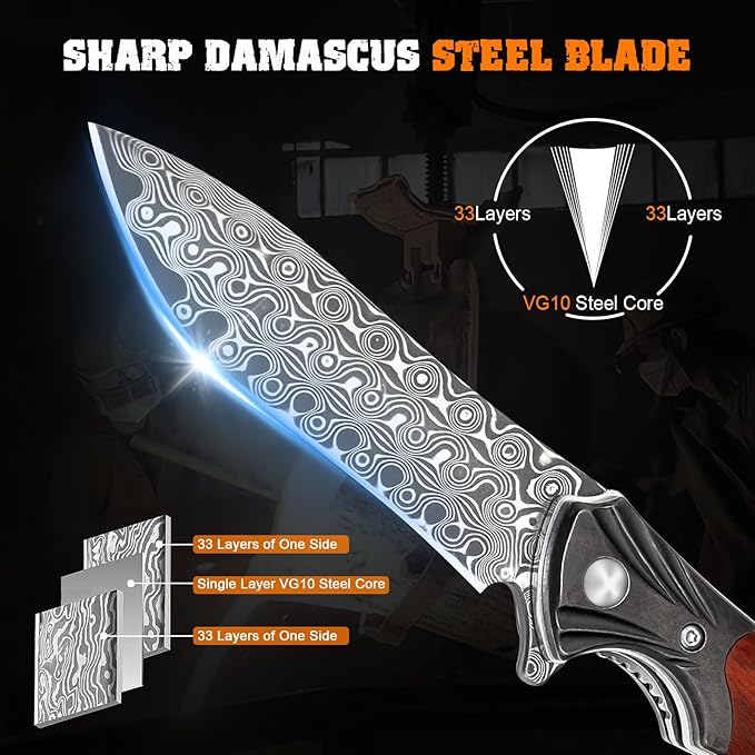 - Premium Damascus Steel Blade: Crafted with a 67-layer Damascus steel blade featuring a VG10 steel core, this handmade pocket knife offers outstanding durability, razor-sharp edge, and long-lasting performance