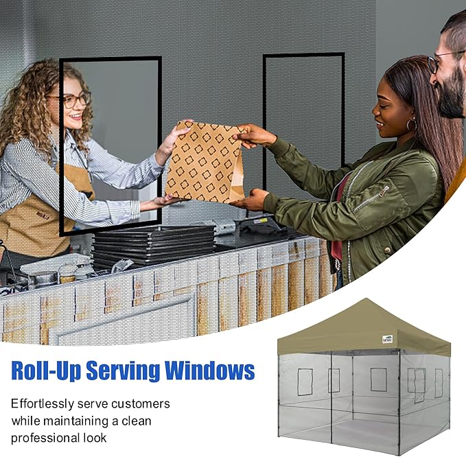 Eurmax USA 10'x10' Pop-up Canopy Tent Commercial Instant Canopies with 4 Removable Zipper End Food Service Wall kit and Roller Bag, Bonus 4 SandBags(Khaki)