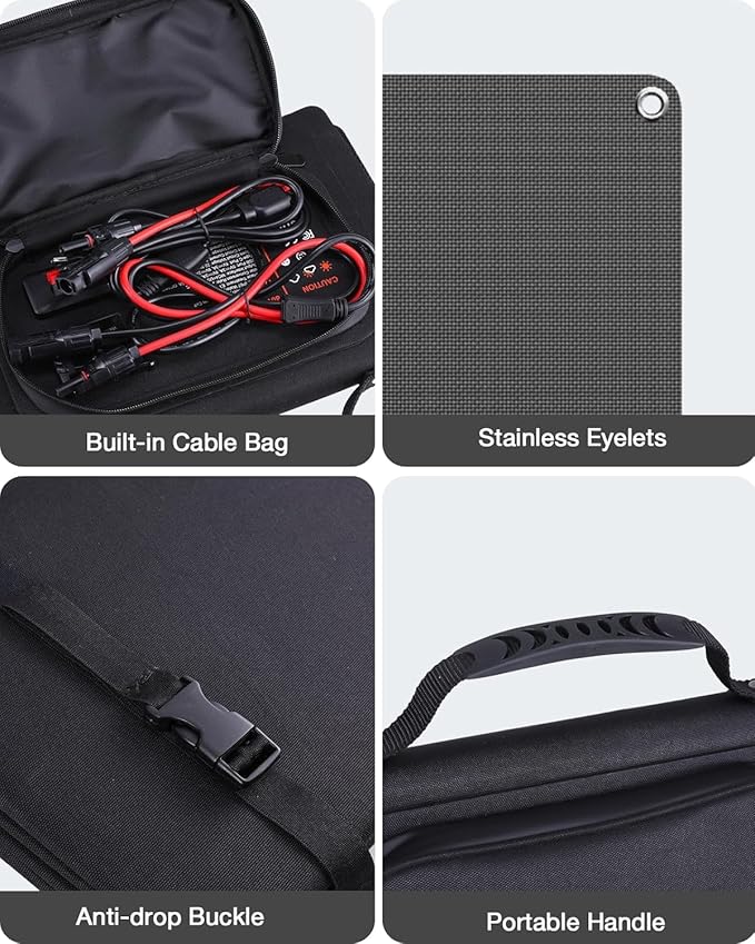 - 【24% High Conversion Efficiency】This 80W foldable solar panel boasts a high conversion efficiency of up to 24%. It is meticulously crafted from high-quality monocrystalline silicon solar cells, UV-resistant EVA, and high-transmittance ETFE. It efficiently converts sunlight into electricity, and its built-in smart chip intelligently identifies connected devices and provides optimized charging speeds for each device.
